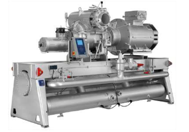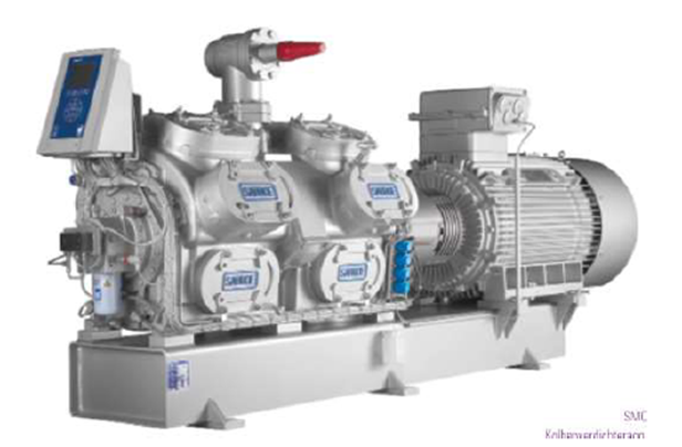 To skruekompressorer i serie afsluttet med en stempelkompressor. Fabrikat Sabroe.